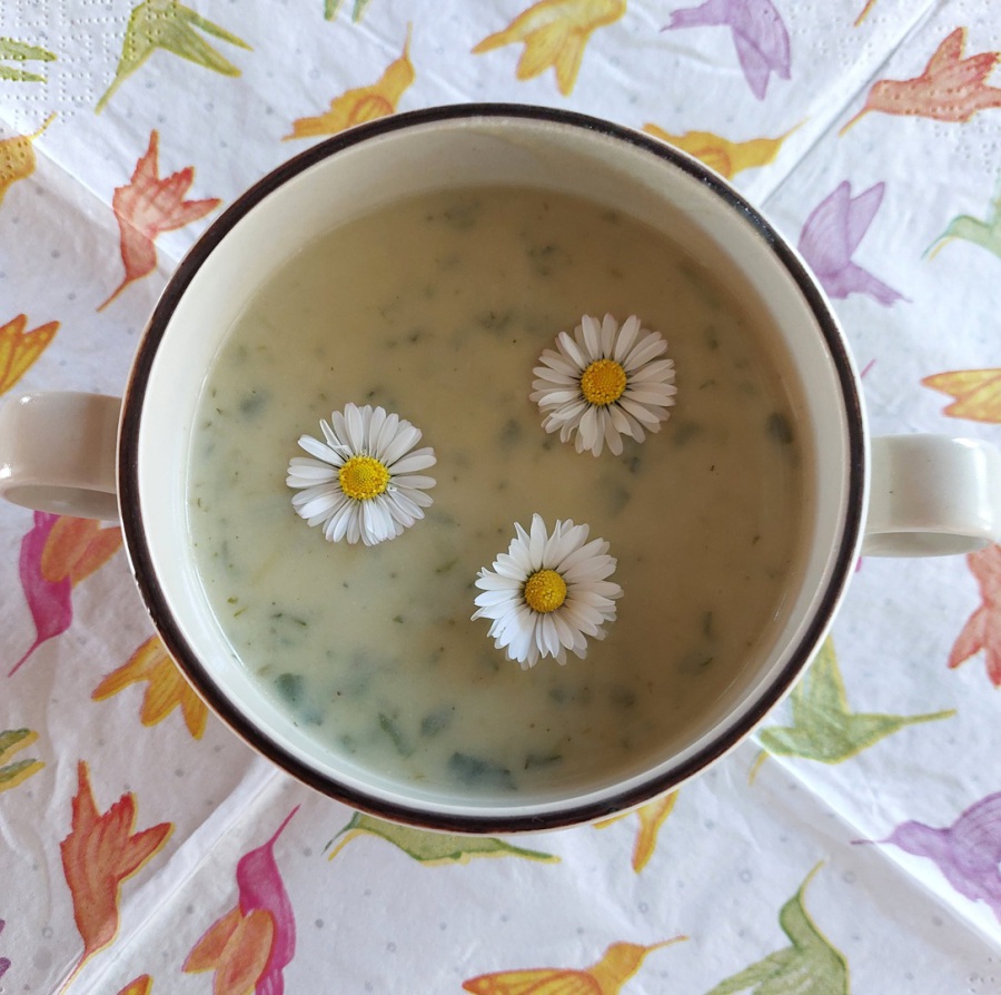 Abschmecken und mit ein paar Gänseblümchenblüten garnieren.